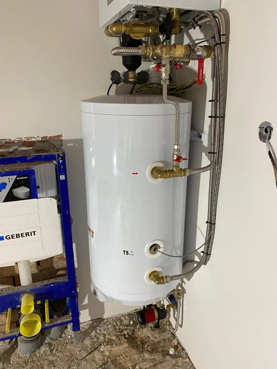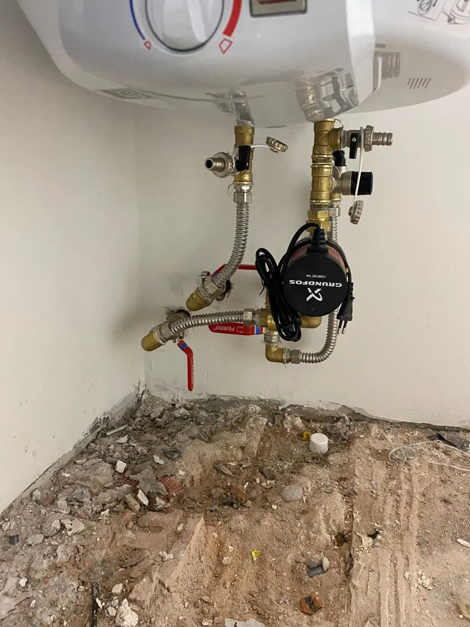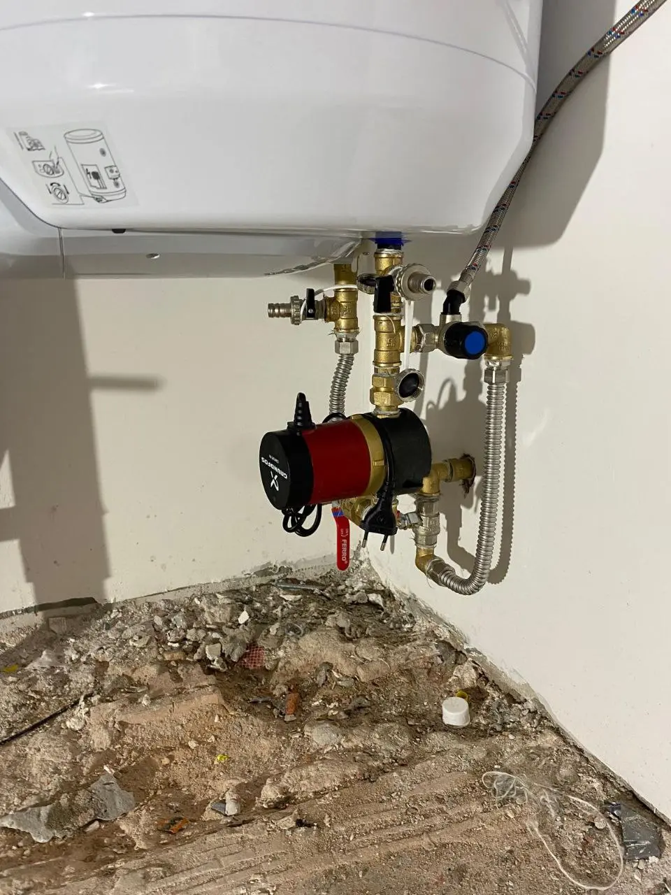 Súčasťou realizácie bolo aj prepojenie kotla so zásobníkom teplej vody, montáž ventilov, filtračných prvkov, čerpadla a kontrola správneho zapojenia celej zostavy. Výsledkom je kompaktné a technicky čisté riešenie, ktoré zabezpečuje spoľahlivý ohrev vody a efektívne fungovanie systému.